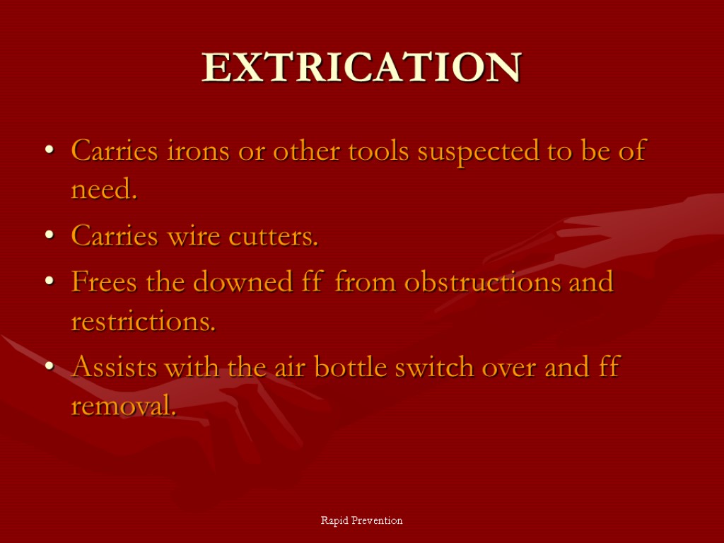 Rapid Prevention EXTRICATION Carries irons or other tools suspected to be of need. Carries wire cutters. Frees the downed ff from obstructions and restrictions. Assists with the air bottle switch over and ff removal.