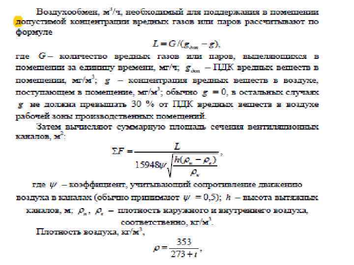 • Затем вычисляют суммарную площадь сечения вентиляционных каналов, м 2: где y – коэффициент, учитывающий сопротивление движению воздуха в каналах (обычно принимают y = 0, 5); h – высота вытяжных • каналов, м; rн , rв – плотность наружного и внутреннего воздуха, соответственно, кг/м 3. • Плотность воздуха, кг/м 3, r = 353 / 273+t где t – температура воздуха, при которой определяют плотность, 0 С.