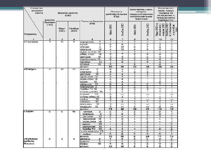 • Анализ полученных значений коэффициентов рациональности ассортимента товаров обследуемых организаций и выявленного ранее конкурентного положения продавцов мебельных товаров показал следующее: выше значение коэффициента рациональности ассортимента и, следовательно, более рациональный ассортимент у организаций — лидеров рынка, далее по убыванию значения коэффициента рациональности следуют претенденты на лидерство на рынке, последователи. И наконец, самые низкие значения коэффициентов рациональности ассортимента товаров у организаций, попавших по результатам исследования покупательских предпочтений в группу аутсайдеров рынка.