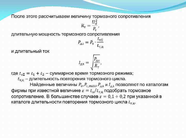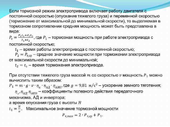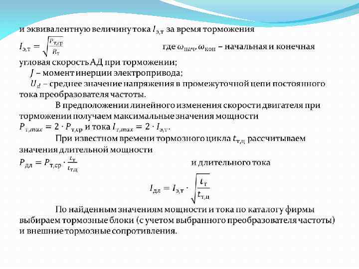 Выбор преобразователей для ЧРЭ Для частотно регулируемого асинхронного (ЧРЭ) электропривода также не обходимо выбирать преобразователь частоты в соответствии с требуемым режимом работы электропривода и необходимой величиной пускового, тормозного и наибольшего момента. Кроме того, следует учитывать воз можность реализации режима торможения, что требует усложнения и удорожания преобразователя частоты. В большинстве случаев применяют резистивные способы торможения частотно регулируемых электроприводов с рассеиванием энергии торможения в самом двигателе, преобразователе частоты и тормозном сопротивлении.
