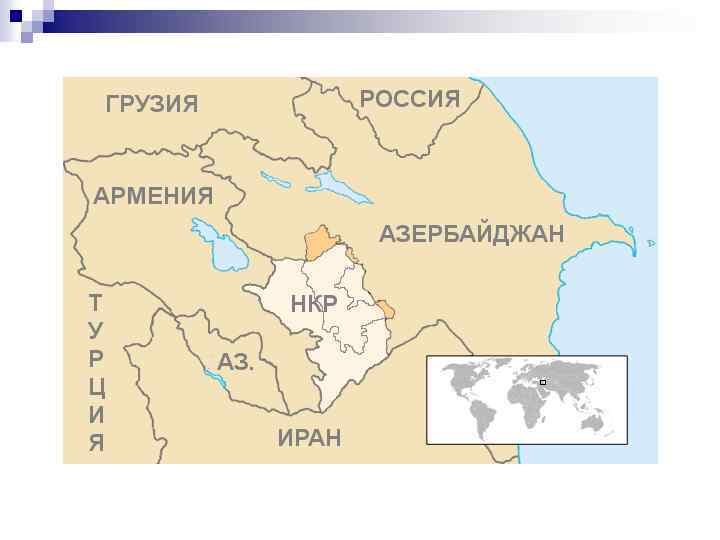 Из истории… Территория Нагорного Карабаха в древности входила в пределы провинции Арцах (в средние века Хаченское княжество). n Нагорный Карабах, населенный преимущественно армянами, в начале XX века дважды (в 1905— 1907 и 1918— 1920 гг) становился ареной кровопролитного армяно-азербайджанского конфликта В 1921 г. постановлением Политбюро ЦК РКП(б) он был включен в состав Азербайджанской ССР с созданием автономии (НКАО — Нагорно-Карабахская автономная область). Это вызвало недовольство армян, на протяжении многих десятилетий требовавших присоединения НКАО к Армении. До середины 1980 -х годов такие требования, однако, редко становились достоянием гласности, а любые действия в этом направлении немедленно подавлялись. n