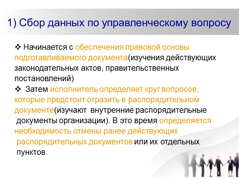 1) Сбор данных по управленческому вопросу Начинается с обеспечения правовой основы подготавливаемого документа(изучения действующих законодательных актов, правительственных постановлений) Затем исполнитель определяет круг вопросов, которые предстоит отразить в распорядительном документе(изучают внутренние распорядительные документы организации). В это время определяется необходимость отмены ранее действующих распорядительных документов или их отдельных пунктов.