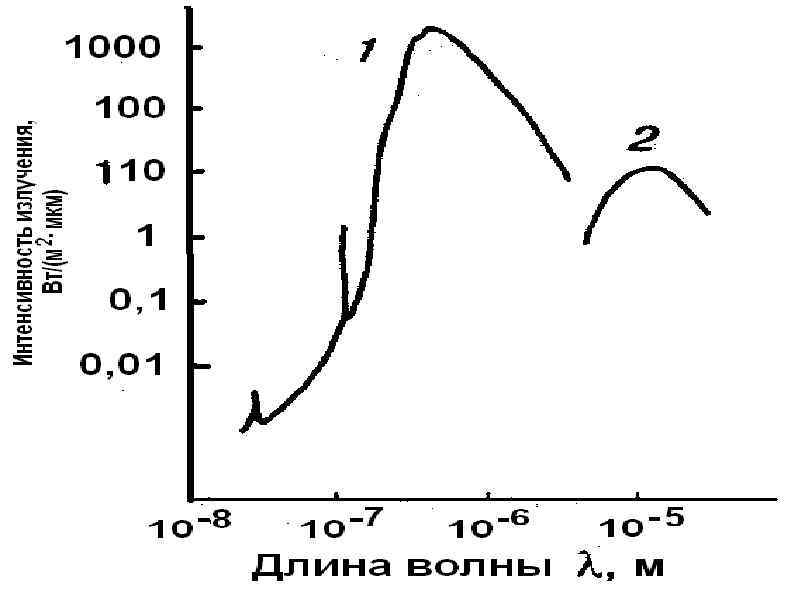 Распределение лучистой энергии в спектре солнечной радиации до поступления в атмосферу (сплошная линия) и в спектре абсолютно черного тела при температуре 6000° (прерывистая линия).
