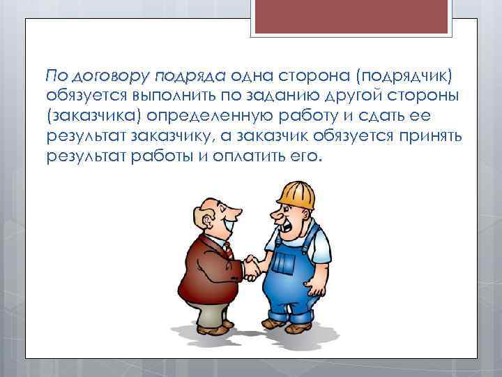 По договору подряда одна сторона (подрядчик) обязуется выполнить по заданию другой стороны (заказчика) определенную работу и сдать ее результат заказчику, а заказчик обязуется принять результат работы и оплатить его.