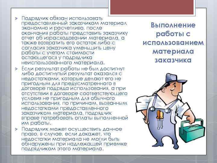 Ø Ø Ø Подрядчик обязан использовать предоставленный заказчиком материал экономно и расчетливо, после окончания работы представить заказчику отчет об израсходовании материала, а также возвратить его остаток либо с согласия заказчика уменьшить цену работы с учетом стоимости остающегося у подрядчика неиспользованного материала. Если результат работы не был достигнут либо достигнутый результат оказался с недостатками, которые делают его не пригодным для предусмотренного в договоре подряда использования, а при отсутствии в договоре соответствующего условия не пригодным для обычного использования, по причинам, вызванным недостатками предоставленного заказчиком материала, подрядчик вправе потребовать оплаты выполненной им работы. Подрядчик может осуществить данное право, в случае, если докажет, что недостатки материала не могли быть обнаружены при надлежащей приемке подрядчиком этого материала. Выполнение работы с использованием материала заказчика