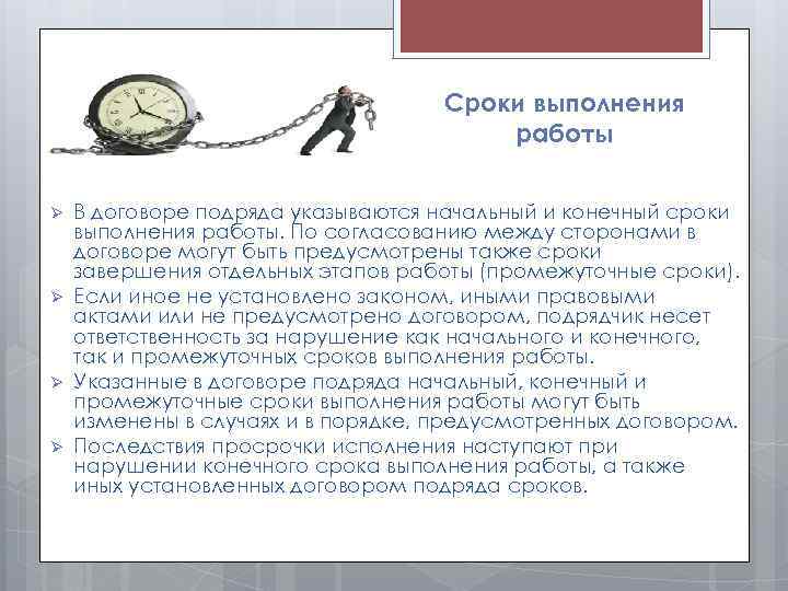 Сроки выполнения работы Ø Ø В договоре подряда указываются начальный и конечный сроки выполнения работы. По согласованию между сторонами в договоре могут быть предусмотрены также сроки завершения отдельных этапов работы (промежуточные сроки). Если иное не установлено законом, иными правовыми актами или не предусмотрено договором, подрядчик несет ответственность за нарушение как начального и конечного, так и промежуточных сроков выполнения работы. Указанные в договоре подряда начальный, конечный и промежуточные сроки выполнения работы могут быть изменены в случаях и в порядке, предусмотренных договором. Последствия просрочки исполнения наступают при нарушении конечного срока выполнения работы, а также иных установленных договором подряда сроков.