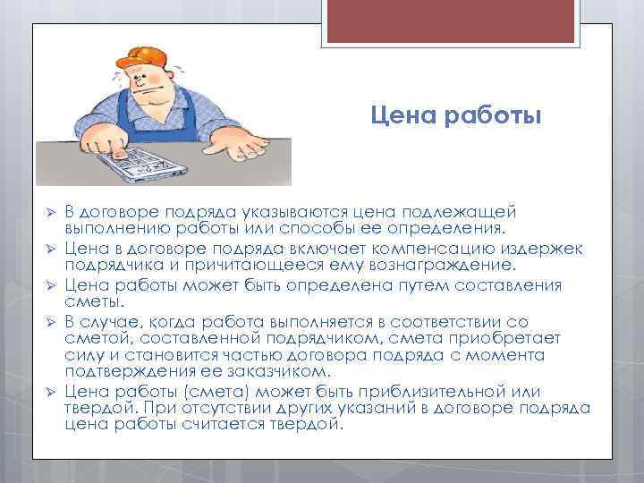 Цена работы Ø Ø Ø В договоре подряда указываются цена подлежащей выполнению работы или способы ее определения. Цена в договоре подряда включает компенсацию издержек подрядчика и причитающееся ему вознаграждение. Цена работы может быть определена путем составления сметы. В случае, когда работа выполняется в соответствии со сметой, составленной подрядчиком, смета приобретает силу и становится частью договора подряда с момента подтверждения ее заказчиком. Цена работы (смета) может быть приблизительной или твердой. При отсутствии других указаний в договоре подряда цена работы считается твердой.