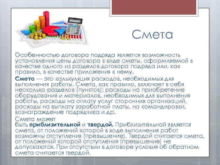 Смета Особенностью договора подряда является возможность установления цены договора в виде сметы, оформляемой в качестве одного из разделов договора подряда или, как правило, в качестве приложения к нему. Смета — это калькуляция расходов, необходимых для выполнения работы. Смета, как правило, включает в себя несколько разделов (пунктов): расходы на приобретение оборудования и материалов, необходимых для выполнения работы, расходы на оплату услуг сторонних организаций, расходы на выплату заработной платы, на командировки, вознаграждение подрядчика и др. Смета может быть приблизительной и твердой. Приблизительной является смета, от положений которой в ходе выполнения работ возможны отступления (превышение). Твердой считается смета, от положений которой отступления (превышение) не допускаются. При отсутствии в договоре условия об обратном смета считается твердой.