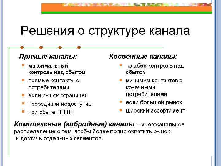 ВЫБОР КАНАЛА РАСПРЕДЕЛЕНИЯ множество предприятий, состоящих из производителей готовых товаров, оптовых и розничных торговцев, участвующих в процессе товародвижения.