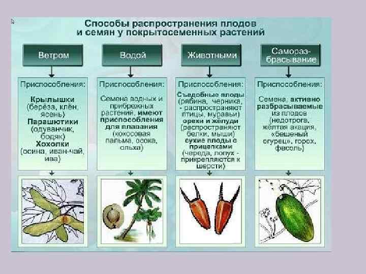 Название растения Способ распространения семян приспособления Крыжовник, смородина, виноград животными Сочный околоплодник Одуванчик ветром Плод с парашютиком Клен ветром Плод с крылышками Желудь животными Много питательных веществ Репейник животными Крючочки на плодах Недотрога саморазбрасывание Скручиваются створки плода Бешеный огурец саморазбрасывание Высокое давление внутри плода Кокосовый орех водой Плод легкий, не тонет