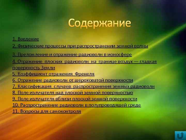 Содержание 1. Введение 2. Физические процессы при распространении земной волны 3. Преломление и отражение радиоволн в ионосфере 4. Отражение плоских радиоволн на границе воздух — гладкая поверхность Земли 5. Коэффициент отражения Френеля 6. Отражение радиоволн от шероховатой поверхности 7. Классификация случаев распространения земных радиоволн 8. Поле излучателя над плоской земной поверхностью 9. Поле излучателя вблизи плоской земной поверхности 10. Распространение радиоволн в полупроводящей среде 11. Вопросы для самоконтроля