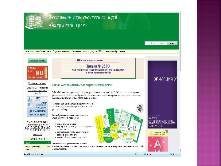 http: //festival. 1 september. ru «Фестиваль педагогических идей «Открытый урок» » САМЫЙ МАССОВЫЙ ОТКРЫТЫЙ ПЕДАГОГИЧЕСКИЙ ФОРУМ! В 2013/2014 учебном году фестиваль «Открытый урок» проводится в одиннадцатый раз. С 2003 года в фестивале приняли участие более 110 000 работников образования. Все присылаемые на фестиваль работы распределяются по разделам, соответствующим самым разным областям школьной жизни. Фестиваль стал самым массовым и представительным открытым педагогическим форумом. Материалы всех участников публикуются. Каждый участник получает полный комплект итоговых материалов, включающий: персональный диплом; сертификат, подтверждающий факт публикации материалов; компакт-диски (DVD) с полнотекстовыми версиями всех материалов; книги — сборники тезисов всех статей*.