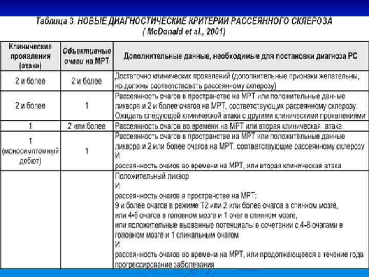 МРТ-критерии Ø Ø Наличие не менее одного очага с накоплением контраста или девяти очагов повышенной плотности. Наличие не менее одного инфратенториального очага. Наличие не менее одного юкстакортикального очага (очага, вовлекающего субкортикальные волокна). Наличие не менее трех перивентрикулярных очагов более 3 мм в диаметре.
