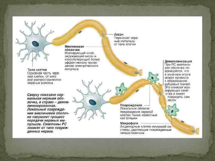 Введение Рассеянный склероз (демиелинизирующее заболевание) - это заболевание головного и спинного мозга, которое относится к центральной нервной системе. В норме нервные волокна окутаны защитной оболочкой, которая называется миелин. При рассеянном склерозе эта оболочка повреждается и пораженные нервы не могут нормально работать. Образование рубцов на миелине (склероз) происходит рассеянно на маленьких участках в различных областях головного и спинного мозга. Именно поэтому заболевание называется рассеянным склерозом.