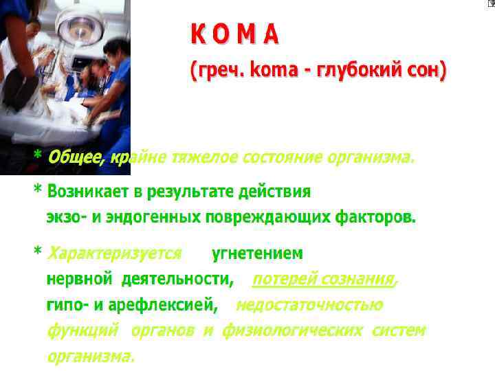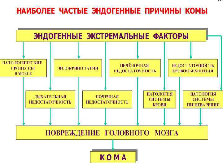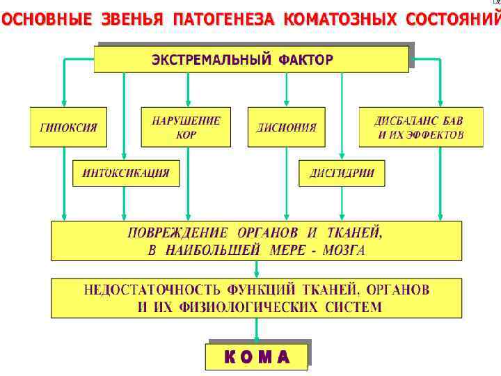 Обморок ( «синкопе» ) Это внезапная непродолжительная потеря сознания вследствие преходящей ишемии головного мозга. Возникает рефлекторно. Ведущий фактор в патогенезе ↓ АД до уровня, при котором не обеспечивается достаточная перфузия мозга. Основные патогенетические звенья: ↓ АД вследствие уменьшения ПСС при системной вазодилятации (психогенные обмороки, обусловленные гиперактивностью парасимпатическим отделом ВНС, ортостатическая гипотензия); нарушения ритма сердца (синдром Морганьи — Эдемса — Стокса); уменьшение содержания в крови кислорода.