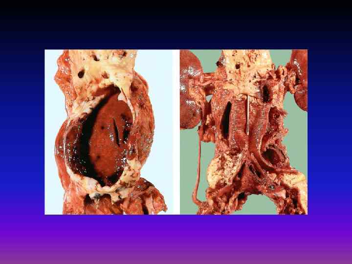 Венозная гиперемия Патологический процесс, характеризующийся полнокровием ткани, связанным с затруднением оттока и крови в венах при нормальном или пониженном притоке Различают общую и местную ВГ: • чаще встречается общая. • местная развивается при пережатии жгутом, гипсом, опухолью. Макроскопическая картина местной ВГ: • синюшная окраска тканей (цианоз), • местное понижение температуры, • с разреза стекает большое количество темной венозной крови. По течению: острая и хроническая