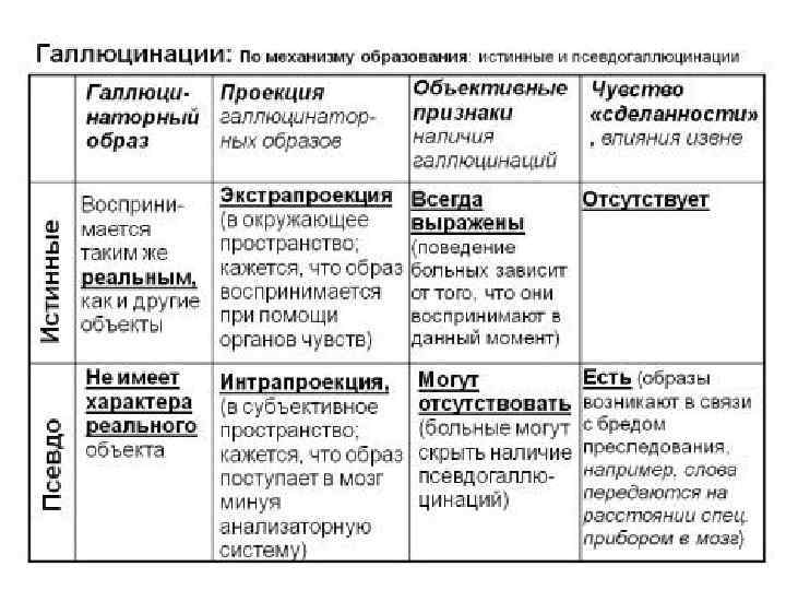 Галлюцинации По степени сложности: • Элементарные - простейшие феномены (вспышки света, щелчки, стук и т. д. ) • Простые - возникают только в одном из анализаторов • Сложные - возникают сразу в нескольких анализаторах • Сценообразные - изменяется вся окружающая обстановка. Указывает на развитие помрачения сознания. По анализаторам: • Зрительные – элементарные - фотопсии (зрительные образы, лишенные конкретной формы в виде пятен, вспышек, бликов) – макро- и микроптические - галлюцинаторные образы представляют собой увеличенные или уменьшенные; – гипнагогические – возникают перед засыпанием, гипнопомпические - возникают перед пробуждением. • Слуховые – элементарные – акоазмы (оклики, неясные шумы, щелчки, стук); – в форме речи – вербальные: • моно- и поливокальные - один или несколько голосов, соответственно; • по содержанию: осуждающие, угрожающие, восхваляющие, комментирующие, императивные. • Тактильные и висцеральные - восприятие каких-либо объектов на поверхности тела (на коже или слизистых, внутри них или под ними) или во внутренних органах. Объекты могут быть одушевленными или неодушевленными. • Вкусовые - появление вкуса • Обонятельные - появление запаха