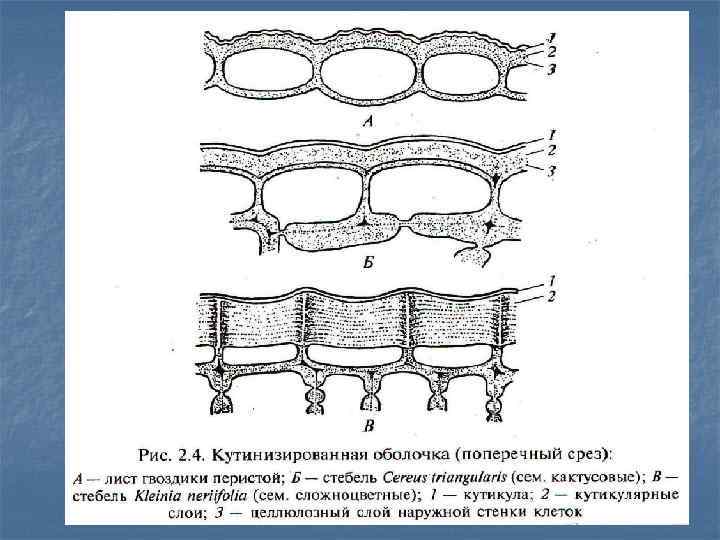 n n Стенки клеток эпидермы имеют неравномерное утолщение. Наружная поверхность клеток утолщена и у многих растений пропитывается кутином с образованием кутикулы. Кутикула иногда покрывается воском и формирует непроницаемый для воды и газов покров. Производными клеток эпидермы листьев и стеблей являются устьица, устьичные аппараты и трихомы.