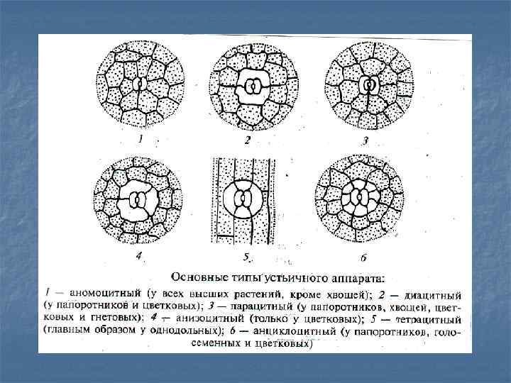 В зависимости от количества и расположения побочных клеток относительно замыкающих клеток различают следующие типы устьичных аппаратов: Тип устьичного аппарата Количество побочных клеток Характер расположения побочных клеток относительно устьичной щели Для каких растений характерно Аномоцитный Несколько Вокруг замыкающих клеток Все растения кроме хвощей Диацитный Две Перпендикулярно Губоцветные, гвоздичные Парацитный Две Параллельно Папоротники, хвощи, ряд цветковых Анизоцитный Три, одна крупнее или мельче остальных. Вокруг замыкающих клеток Только цветковые растения Тетрацитный Четыре Общие клеточные стенки параллельны устьичной щели Однодольные Энциклоцитный Несколько Образуют узкое кольцо вокруг замыкающих клеток Папоротники, голосемянные, ряд цветковых.