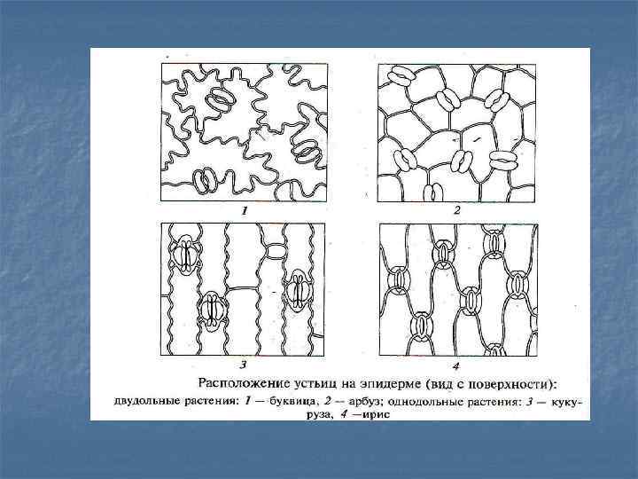 Диагностическими признаками по эпидерме являются: форма и размеры клеток, тип устьичного аппарата, количество устьиц на 1 мм, наличие и вид трихом. n Устьица и трихомы на эпидерме листьев и стеблей, корневые волоски на эпиблеме корня могут отсутствовать, что также является диагностическим признаком. n