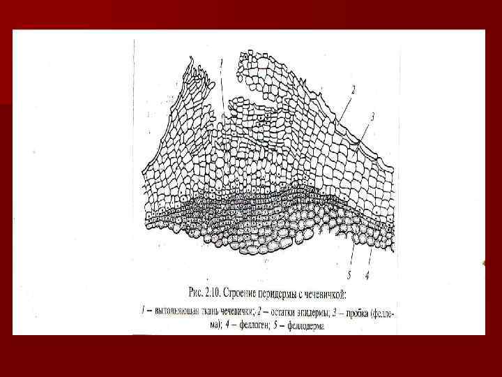 • Для газообмена и транспирации в пробке имеются чечевички. • Они находятся там, где располагаются устьица, но их меньше, чем устьиц. Имеют вид бугорков, полос. • В месте образования чечевички пробковый камбий откладывает наружу много паренхимных рыхлых клеток, заполненных воздухом. Они прорывают эпидерму и поверхностные слои пробки, устанавливая связь внутренней части стебля с внешней средой.