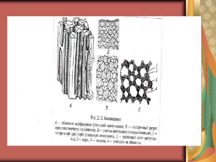 • • ь ь Типы механических тканей: колленхима склеренхима: волокна склереиды Колленхима – простая, первичная опорная ткань, состоит из живых колленхимных клеток, содержащих хлоропласты, стенки клеток первичные, нелигнифицированные, имеют неравномерное утолщение в отдельных местах.