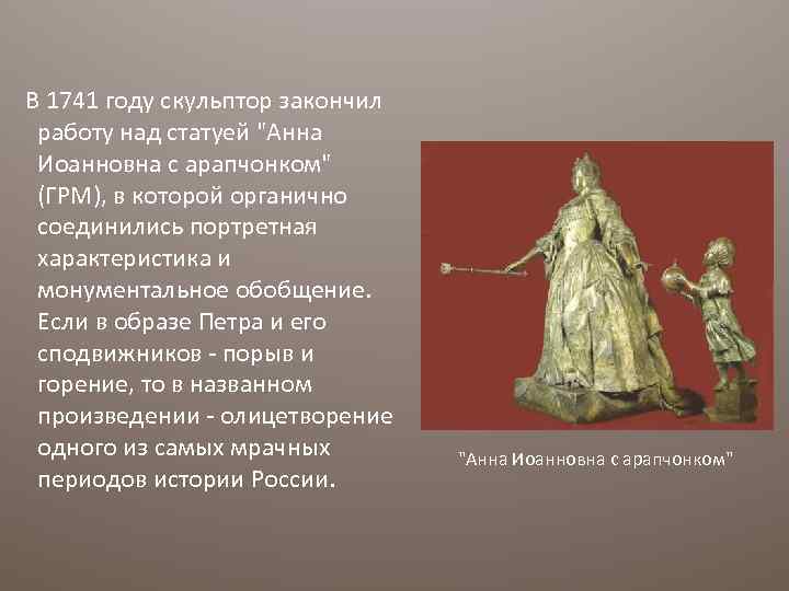 В 1741 году скульптор закончил работу над статуей "Анна Иоанновна с арапчонком" (ГРМ), в которой органично соединились портретная характеристика и монументальное обобщение. Если в образе Петра и его сподвижников - порыв и горение, то в названном произведении - олицетворение одного из самых мрачных периодов истории России. "Анна Иоанновна с арапчонком"