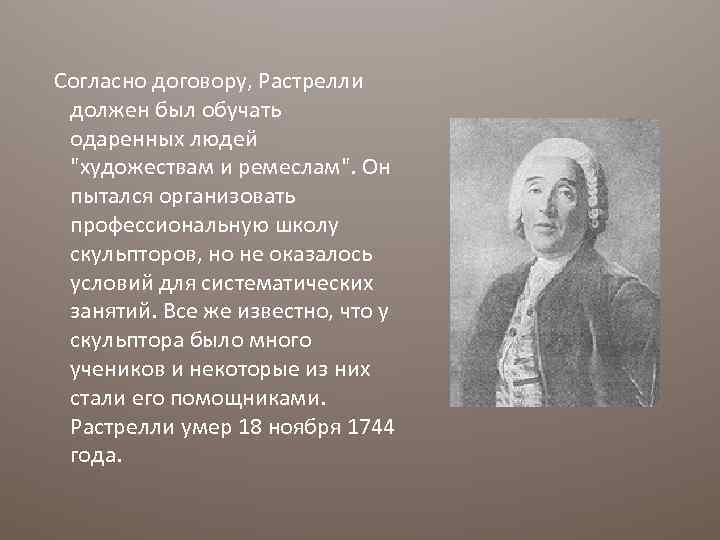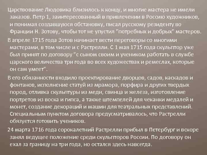 Царствование Людовика близилось к концу, и многие мастера не имели заказов. Петр 1, заинтересованный в привлечении в Россию художников, и понимая создавшуюся обстановку, писал русскому резиденту во Франции Н. Зотову, чтобы тот не упустил "потребных и добрых" мастеров. В апреле 1715 года Зотов начинает вести переговоры со многими мастерами, в том числе и с Растрелли. С 1 мая 1715 года скульптор уже был принят по договору "с сыном своим и учеником работать в службе царского величества три года во всех художествах и ремеслах, которые он сам умеет". В его обязанности входило проектирование дворцов, садов, каскадов и фонтанов, исполнение статуй из мрамора, порфира и других твердых пород, отливка скульптуры из меди, свинца и железа, изготовление портретов из воска и гипса, а также штемпелей для чеканки медалей и монет, создание декораций и машин для театральных представлений. Специальным пунктом договора предусматривалось, что Растрелли обязуется готовить учеников. 24 марта 1716 года сорокалетний Растрелли прибыл в Петербург и вскоре занял ведущее положение среди скульпторов России. По договору он ехал за границу на три года, но остался здесь навсегда.