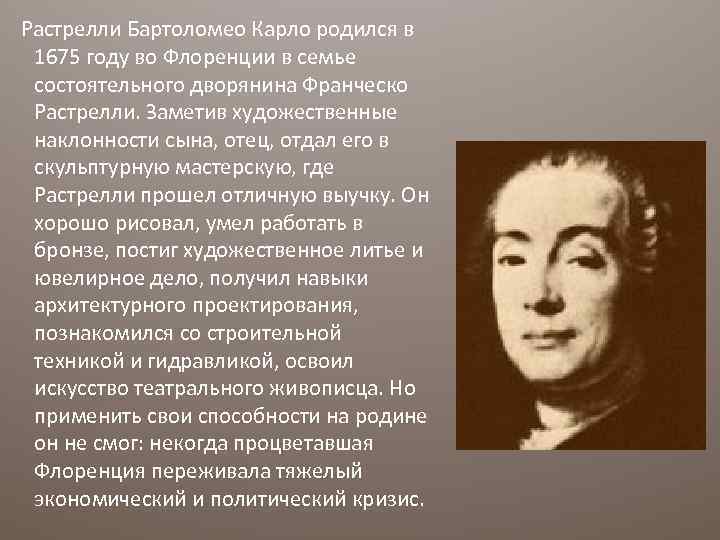Растрелли Бартоломео Карло родился в 1675 году во Флоренции в семье состоятельного дворянина Франческо Растрелли. Заметив художественные наклонности сына, отец, отдал его в скульптурную мастерскую, где Растрелли прошел отличную выучку. Он хорошо рисовал, умел работать в бронзе, постиг художественное литье и ювелирное дело, получил навыки архитектурного проектирования, познакомился со строительной техникой и гидравликой, освоил искусство театрального живописца. Но применить свои способности на родине он не смог: некогда процветавшая Флоренция переживала тяжелый экономический и политический кризис.