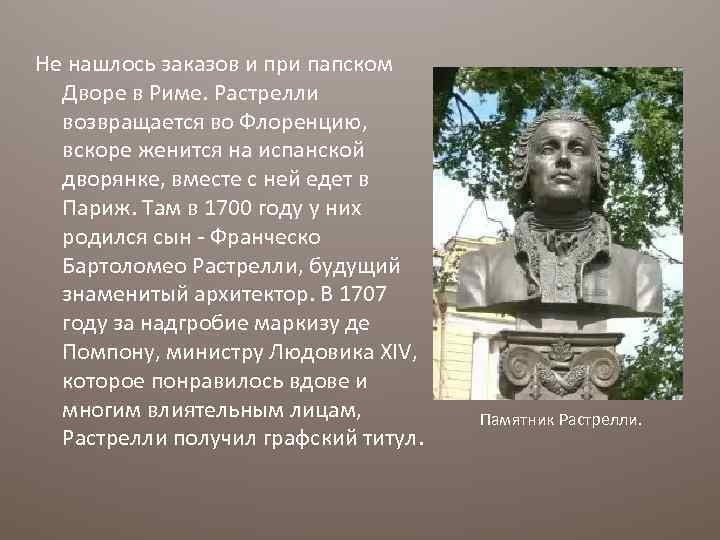 Не нашлось заказов и при папском Дворе в Риме. Растрелли возвращается во Флоренцию, вскоре женится на испанской дворянке, вместе с ней едет в Париж. Там в 1700 году у них родился сын - Франческо Бартоломео Растрелли, будущий знаменитый архитектор. В 1707 году за надгробие маркизу де Помпону, министру Людовика XIV, которое понравилось вдове и многим влиятельным лицам, Растрелли получил графский титул. Памятник Растрелли.