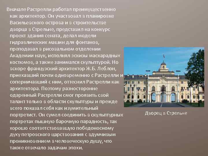 Вначале Растрелли работал преимущественно как архитектор. Он участвовал в планировке Васильевского острова и в строительстве дворца в Стрельне, представил на конкурс проект здания сената, делал модели гидравлических машин для фонтанов, преподавал в рисовальном отделении Академии наук, исполнял эскизы маскарадных костюмов, а также занимался скульптурой. Но вскоре французский архитектор Ж. Б. Леблон, приехавший почти одновременно с Растрелли и соперничавший с ним, оттеснил Растрелли как архитектора. Поэтому разносторонне одаренный Растрелли смог проявить свой талант только в области скульптуры и прежде всего показал себя как изумительный портретист. Он сумел соединить в скульптурных портретах пышную барочную парадность, так хорошо соответствовавшую победоносному духу петровского царствования с вдумчивым проникновением в человеческую душу, что также отвечало задачам эпохи. Дворец в Стрельне