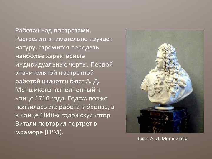 Работая над портретами, Растрелли внимательно изучает натуру, стремится передать наиболее характерные индивидуальные черты. Первой значительной портретной работой является бюст А. Д. Меншикова выполненный в конце 1716 года. Годом позже появилась эта работа в бронзе, а в конце 1840 -х годов скульптор Витали повторил портрет в мраморе (ГРМ). бюст А. Д. Меншикова
