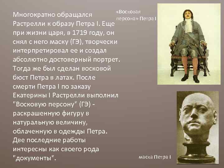 «Восковая Многократно обращался персона» Петра I Растрелли к образу Петра I. Еще при жизни царя, в 1719 году, он снял с него маску (ГЭ), творчески интерпретировал ее и создал абсолютно достоверный портрет. Тогда же был сделан восковой бюст Петра в латах. После смерти Петра I по заказу Екатерины I Растрелли выполнил "Восковую персону" (ГЭ) раскрашенную фигуру в натуральную величину, облаченную в одежды Петра. Две последние работы интересны как своего рода маска Петра I "документы".
