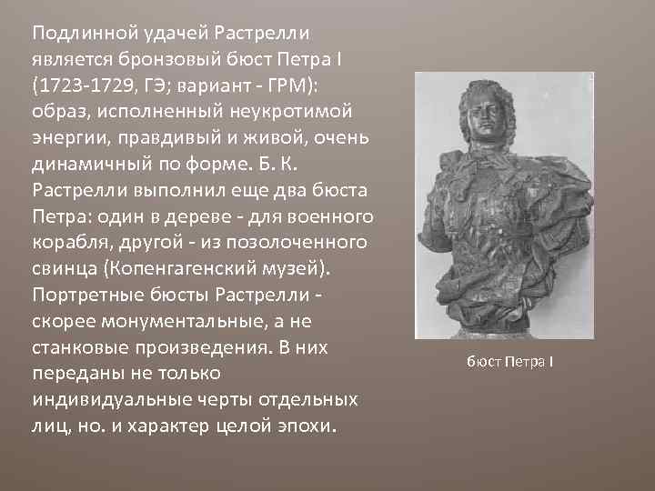 Подлинной удачей Растрелли является бронзовый бюст Петра I (1723 -1729, ГЭ; вариант - ГРМ): образ, исполненный неукротимой энергии, правдивый и живой, очень динамичный по форме. Б. К. Растрелли выполнил еще два бюста Петра: один в дереве - для военного корабля, другой - из позолоченного свинца (Копенгагенский музей). Портретные бюсты Растрелли скорее монументальные, а не станковые произведения. В них переданы не только индивидуальные черты отдельных лиц, но. и характер целой эпохи. бюст Петра I