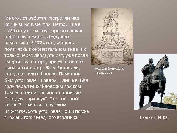 Много лет работал Растрелли над конным монументом Петра. Еще в 1720 году по заказу царя он сделал небольшую модель будущего памятника. В 1724 году модель появилась в окончательном виде. Но только через двадцать лет, уже после смерти скульптора, при участии его сына, архитектора Ф. Б. Растрелли, статую отлили в бронзе. Памятник был установлен Павлом 1 лишь в 1800 году перед Михайловским замком. Там он стоит и поныне с надписью Прадеду - правнук". Это - первый конный памятник в русском искусстве, хоть установлен он и позже знаменитого "Медного всадника". модель будущего памятника памятник Петра I