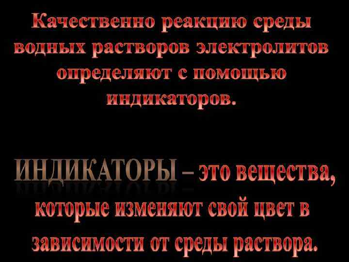 Нейтральная Кислая Щелочная • Среда, в которой количество ионов водорода равно количеству гидроксидионов. • Среда, в которой количество ионов водорода больше количества гидроксидионов. • Среда, в которой количество ионов водорода меньше количества гидроксидионов.