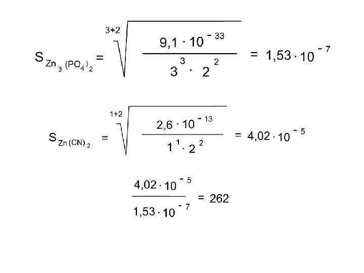 Какая соль более растворима в воде: фосфат цинка или цианид цинка, и во сколько раз? Решение: Zn 3(PO 4)2 m=3 n=2 ПР = 9, 1· 10– 33 Zn(CN)2 m=1 n= 2 ПР = 2, 6· 10– 13
