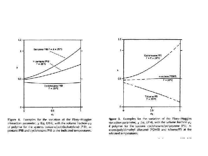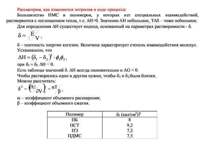 Параметр Флори-Хаггинса Параметр растворимости Хильдебранда дисперсионные силы плотность когезионной энергии Из-за изменения объема появляется температурно независимая константа А (энтр. )
