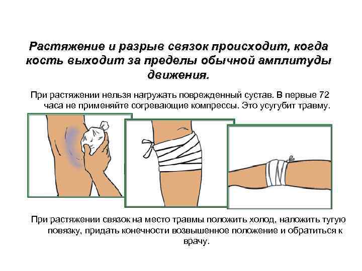 Растяжение и разрыв связок происходит, когда кость выходит за пределы обычной амплитуды движения. При растяжении нельзя нагружать поврежденный сустав. В первые 72 часа не применяйте согревающие компрессы. Это усугубит травму. При растяжении связок на место травмы положить холод, наложить тугую повязку, придать конечности возвышенное положение и обратиться к врачу.