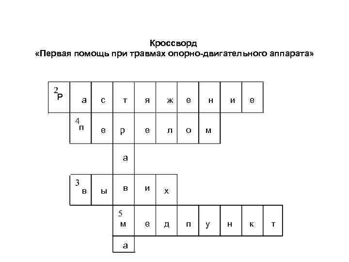 Кроссворд «Первая помощь при травмах опорно-двигательного аппарата» Р а с т я ж е н и е п е р е л о м а в ы в и х м е д п у н к т а