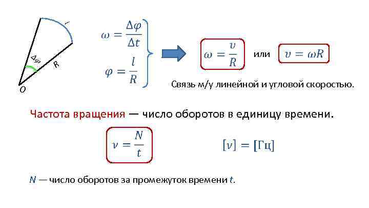 R или Связь м/у линейной и угловой скоростью. O Частота вращения — число оборотов в единицу времени. N — число оборотов за промежуток времени t.