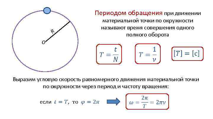 Периодом обращения при движении материальной точки по окружности называют время совершения одного полного оборота R О Выразим угловую скорость равномерного движения материальной точки по окружности через период и частоту вращения: