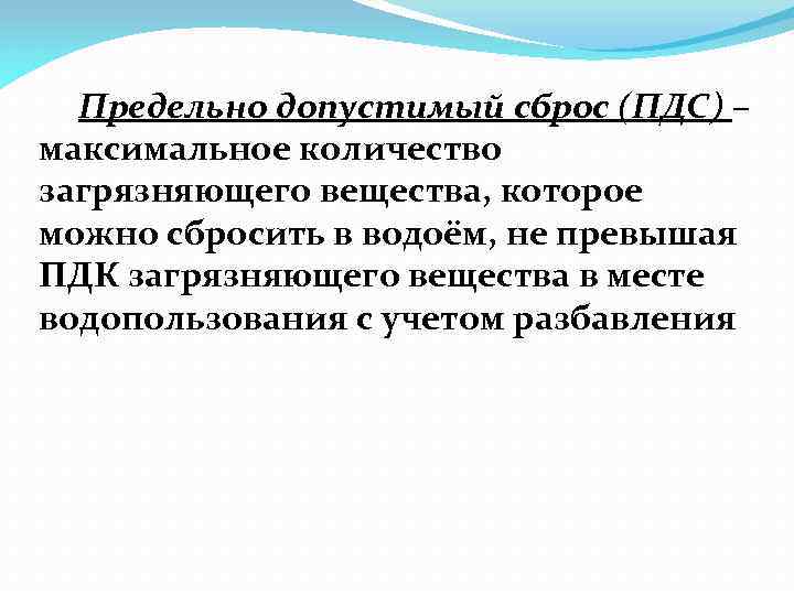 Предельно допустимый сброс (ПДС) – максимальное количество загрязняющего вещества, которое можно сбросить в водоём, не превышая ПДК загрязняющего вещества в месте водопользования с учетом разбавления