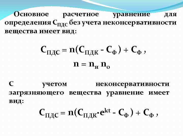 Основное расчетное уравнение для определения СПДС без учета неконсервативности вещества имеет вид: СПДС = n(СПДК - СФ ) + СФ , n = nн n 0 С учетом неконсервативности загрязняющего вещества уравнение имеет вид: СПДС = n(СПДК·еkt - СФ ) + СФ ,