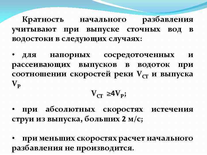 Кратность начального разбавления учитывают при выпуске сточных вод в водостоки в следующих случаях: • для напорных сосредоточенных и рассеивающих выпусков в водоток при соотношении скоростей реки VСТ и выпуска VР VСТ ≥ 4 VР; • при абсолютных скоростях истечения струи из выпуска, больших 2 м/с; • при меньших скоростях расчет начального разбавления не производится.