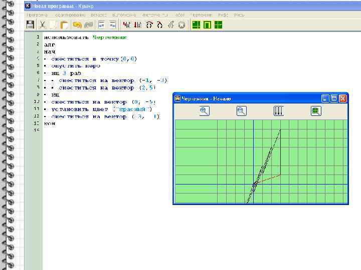 Исполнитель Чертёжник предназначен для построения рисунков на координатной плоскости. Команды исполнителя опустить перо поднять перо cместиться в точку (х, y) сместиться на вектор (±x, ±y) установить цвет(наименование цвета) Чертежник умеет рисовать девятью цветами. Эти цвета: ”черный”, ”белый”, ”красный”, ”оранжевый”, ”желтый”, ”зеленый”, ”голубой”, ”синий”, фиолетовый”. Никаких других цветов, кроме девяти указанных, в Чертежнике нет, никаких смешиваний цветов сделать нельзя.