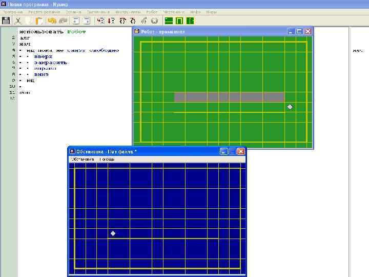№ 0 D 909 E На бесконечном поле имеются две одинаковые вертикальные стены и одна горизонтальная, соединяющая верхние концы стен. Длины стен неизвестны. Робот находится в одной из клеток, расположенных между нижними краями вертикальных стен. Напишите для Робота алгоритм, закрашивающий все клетки, расположенные выше горизонтальной стены непосредственно над ней. Робот должен закрасить только клетки, удовлетворяющие данному условию. Например, для приведённого выше рисунка Робот должен закрасить следующие клетки Конечное расположение Робота может быть произвольным. Алгоритм должен решать задачу для произвольного размера поля и любого допустимого расположения стен внутри прямоугольного поля. При исполнении алгоритма Робот не должен разрушиться, выполнение алгоритма должно завершиться.