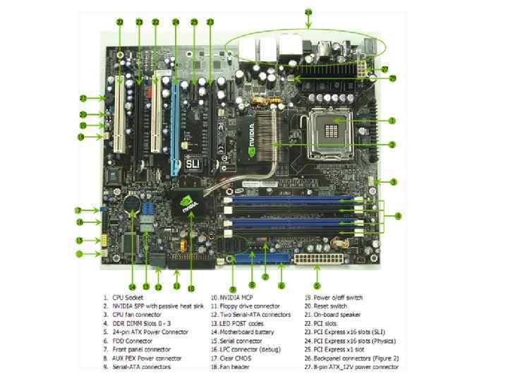 Chipset — набор микросхем, обеспечивающих подключение ЦПУ к ОЗУ и контроллерам периферийных устройств. Как правило, современные наборы системной логики строятся на базе двух СБИС: «северного» и «южного мостов» . Северный мост (англ. Northbridge), MCH (Memory controller hub), системный контроллер — обеспечивает подключение ЦПУ к узлам, использующим высокопроизводительные шины: ОЗУ, графический контроллер. Южный мост (англ. Southbridge), ICH (I/O controller hub), периферийный контроллер — содержит контроллеры периферийных устройств (жёсткого диска, Ethernet, аудио), контроллеры шин для подключения периферийных устройств (шины PCI, PCI-Express и USB), а также контроллеры шин, к которым подключаются устройства, не требующие высокой пропускной способности (LPC — используется для подключения загрузочного ПЗУ; также шина LPC используется для подключения мультиконтроллера (англ. Super I/O) — микросхемы, обеспечивающей поддержку «устаревших» низкопроизводительных интерфейсов передачи данных: последовательного и параллельного интерфейсов, контроллера клавиатуры и мыши).