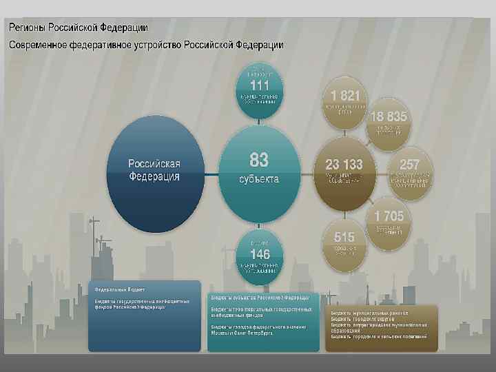 Бюджетное устройство Структура бюджетной системы Бюджетные права органов публичной власти соответствующего уровня Принципы разграничения доходных и расходных полномочий, межбюджетное регулирование 1. Государственное устройство (определяет количество уровней БС РФ) Факторы, влияющие 2. Степень административнона построение территориального деления государства бюджетной системы: (определяет количество бюджетов на каждом уровне) Бюджетная система РФ (ст. 6 БК РФ) - основанная на экономических отношениях и государственном устройстве РФ, регулируемая законодательством РФ совокупность федерального бюджета, бюджетов субъектов РФ, местных бюджетов и бюджетов государственных внебюджетных фондов