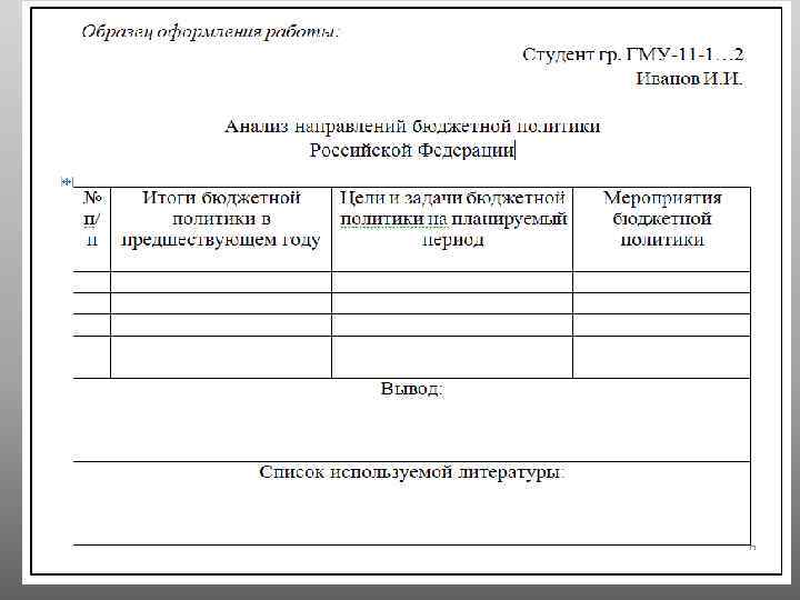 Учебно-методические рекомендации по выполнению самостоятельной работы № 1 «Бюджетная политика Российской Федерации на современном этапе» Рекомендуемые источники: 1) Бюджетное послание Президента РФ на 2013 -2015 гг. , 2014 -2016 гг. (обязательно использовать), Основные направления бюджетной, налоговой политики. 2) Официальные выступления, стенограммы, новостная лента, сайты Правительства РФ и Президента РФ, МФ РФ, федеральных служб и т. д. . 3) Периодическая литература: «Финансы» , «Финансы и кредит» , «Бюджет» и др. Обязательны при заполнении таблицы ссылки на источник литературы (внутритекстовые или подстрочные), вывод (о результатах проведенной финансовой политики в предшествующем году и выбранном курсе в планируемом периоде, список использованной литературы. Самостоятельная работа защищается на семинарском занятии 05. 02. 2014 г. (ГМУ-11 -1), 10. 02. 2014 г. (ГМУ-11 -2). Максимальное количество баллов – 5 баллов. При формировании оценки учитывается оригинальность (работа выполняется индивидуально, не должна быть позаимствована или скопирована у 3 лица), содержание работы, разнообразие используемых источников литературы, устный ответ студента.